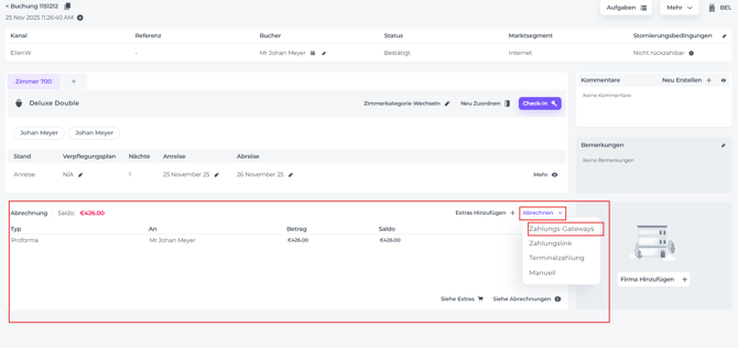 • Klicke im Abrechnungsbereich der Buchungsseite auf Abrechnen - Zahlungs-Gateways: