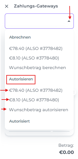 In dem erscheinenden Pop-up-Bildschirm klicke auf den Pfeil unter Zahlungs-Gateway; dies gibt dir die Optionen, die Kreditkarte zu Belasten oder zu Autorisieren.