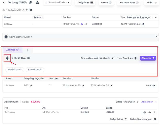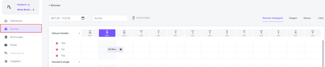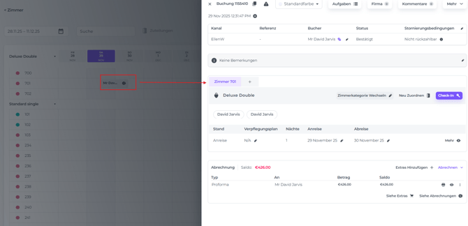 Gehe vom Menü zu Zimmer und finde die betreffende Reservierung: