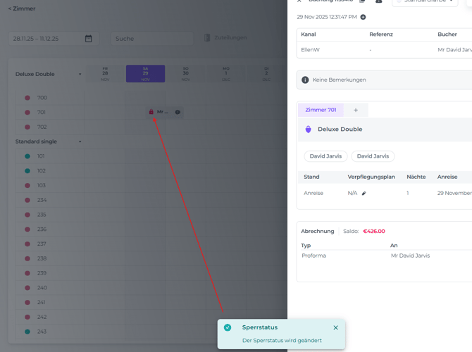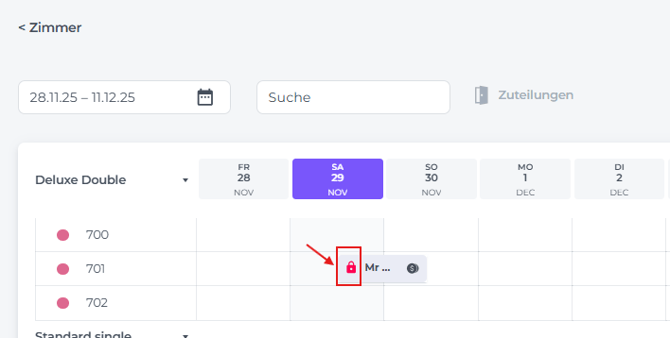Im Zimmerkalender wurde die Reservierung mit einem roten Schloss markiert, was dir deutlich zeigt, dass dieses Zimmer nicht verschoben werden kann: