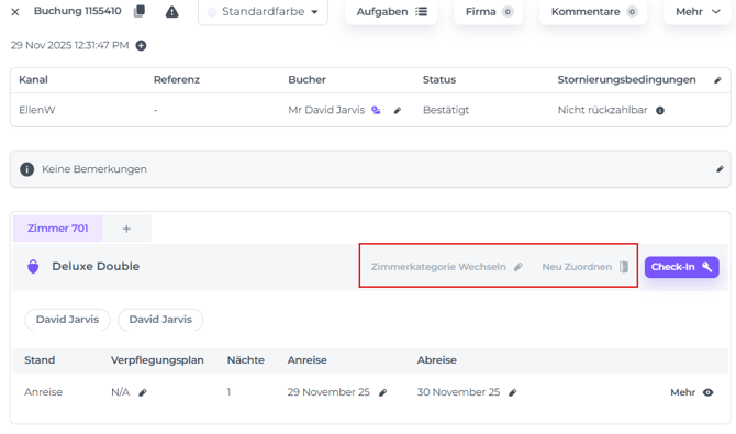 Auf der Reservierungsseite sind die Schaltflächen Zimmerkategorie und Neu Zuordnen deaktiviert: