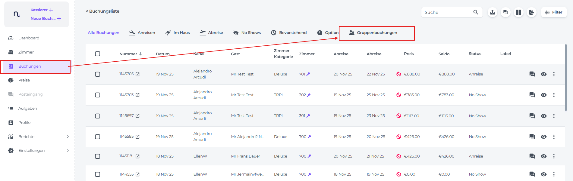 - Wähle im Hauptmenü den Punkt Buchungen und gehe zum Reiter Gruppenbuchungen: