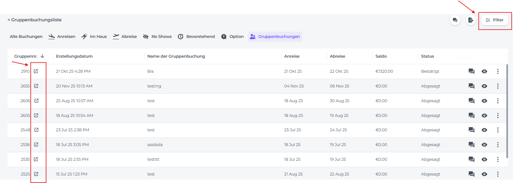 - Öffne die Gruppenbuchung, die du stornieren möchtest, indem du auf das Quadrat+Pfeil-Symbol klickst, oder indem du die Buchung im Filter suchst: