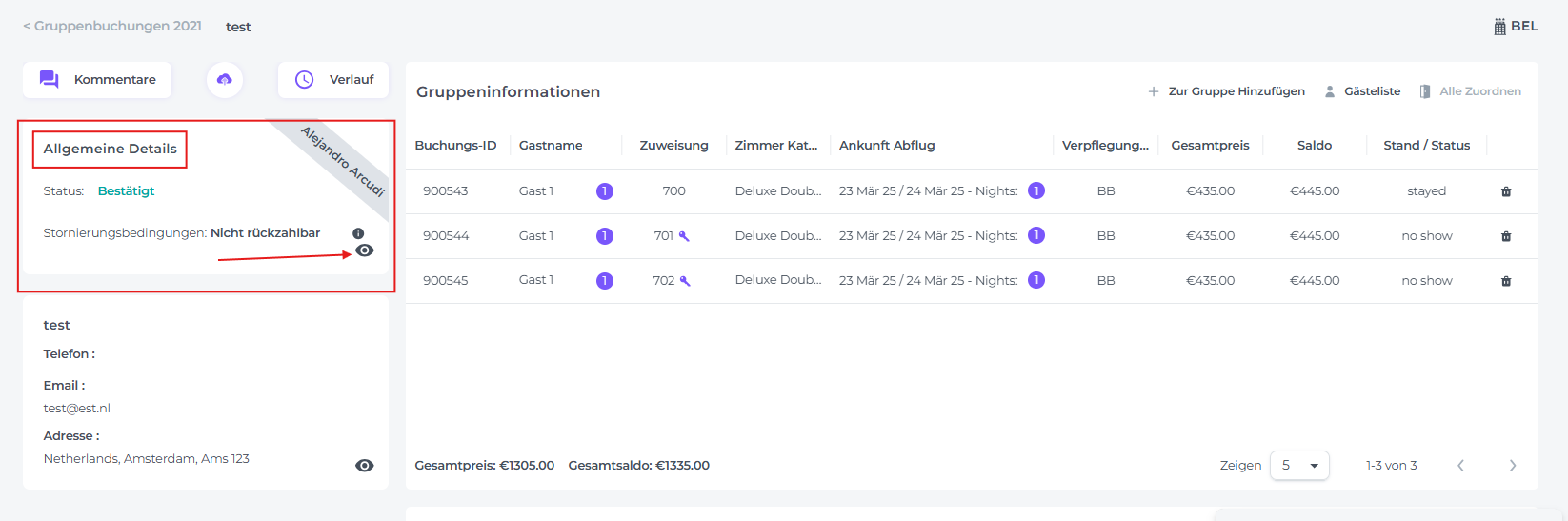 - Gehe auf der Buchungsseite der Gruppenbuchung zu Allgemeine Details und öffne dies durch Klicken auf das Augen-Symbol: