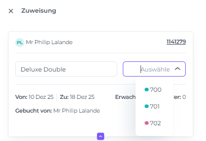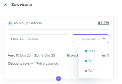 - Wähle im Pop-up-Fenster das gewünschte Zimmer aus, und das Zimmer wird der Buchung zugewiesen: