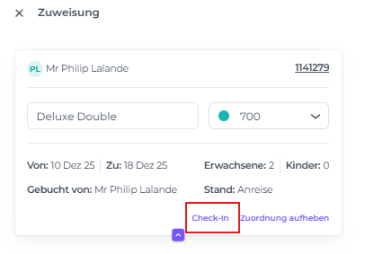 - Wenn die Zuordnung für eine Buchung mit Ankunftsstatus vorgenommen wurde, kannst du von hier aus auch sofort einchecken: