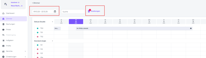 - Gehe über die Seitenleiste zum Zimmerkalender, indem du Zimmer wählst. Der Datumsbereichskalender bestimmt den Zeitraum, der im Zimmerkalender angezeigt wird.