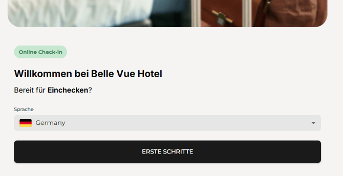 Beim Aufrufen des Online Check-ins fragt das System nach der Sprachauswahl. Die Sprache des Gastes wird automatisch vorausgewählt, kann aber jederzeit angepasst werden.