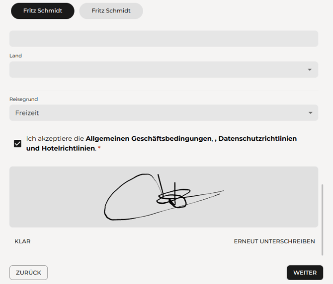 Im nächsten Schritt werden die Gastdaten aktualisiert. Je nach deiner Konfiguration fragt das System genau die Details ab, die du von deinen Gästen benötigst.