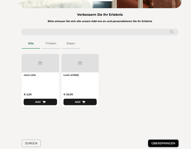 - Falls du für dein Hotel Extras eingerichtet hast, können Gäste diese hier direkt zu ihrer Buchung hinzufügen. Die Proforma wird automatisch um diese Extras ergänzt. Wenn Gäste kein Interesse haben, klicken sie einfach auf Überspringen.