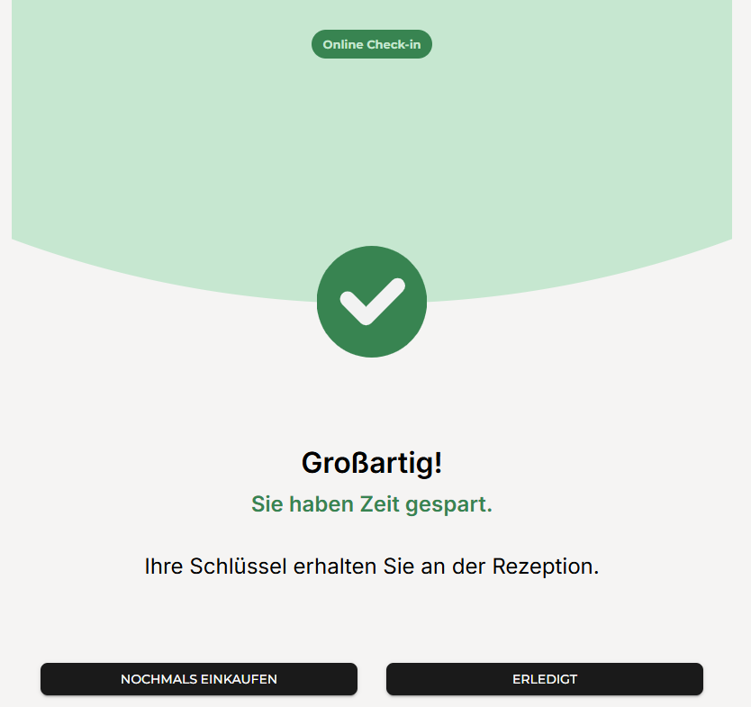 Wenn alle Schritte erledigt sind und die Reservierung entweder bezahlt oder „Später bezahlen“ gewählt wurde, wird die Registrierung mit einem Klick auf Erledigt gespeichert.