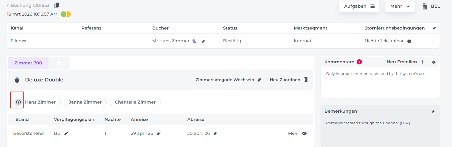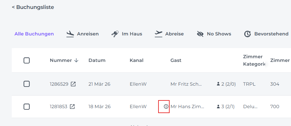 ☝️ Bitte beachte: Wenn der Online Check-in nicht oder unvollständig durchgeführt wurde (z. B. fehlende Gastdaten), macht dich das System durch ein Info-Zeichen darauf aufmerksam.