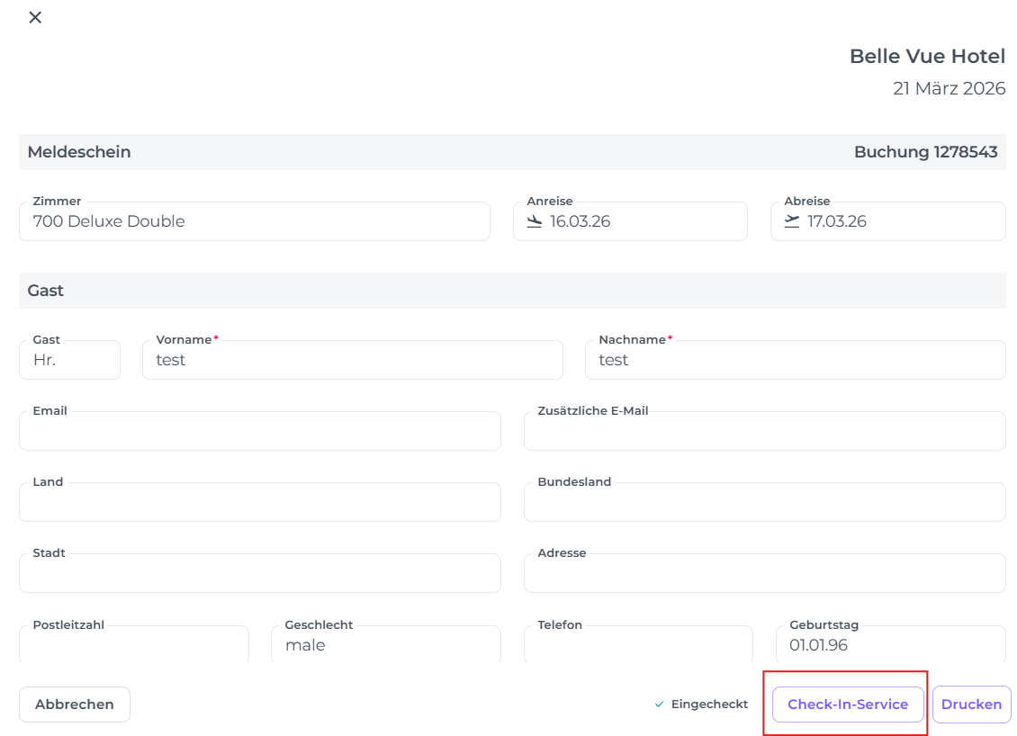 - Drucke zuerst das Registrierungsformular aus und lasse den Gast die Daten handschriftlich ausfüllen und unterschreiben. Du kannst das System später aktualisieren, indem du auf der Buchungsseite Mehr > Meldeschein wählst und über den Button Check-In Service die Daten vom Papierformular überträgst.