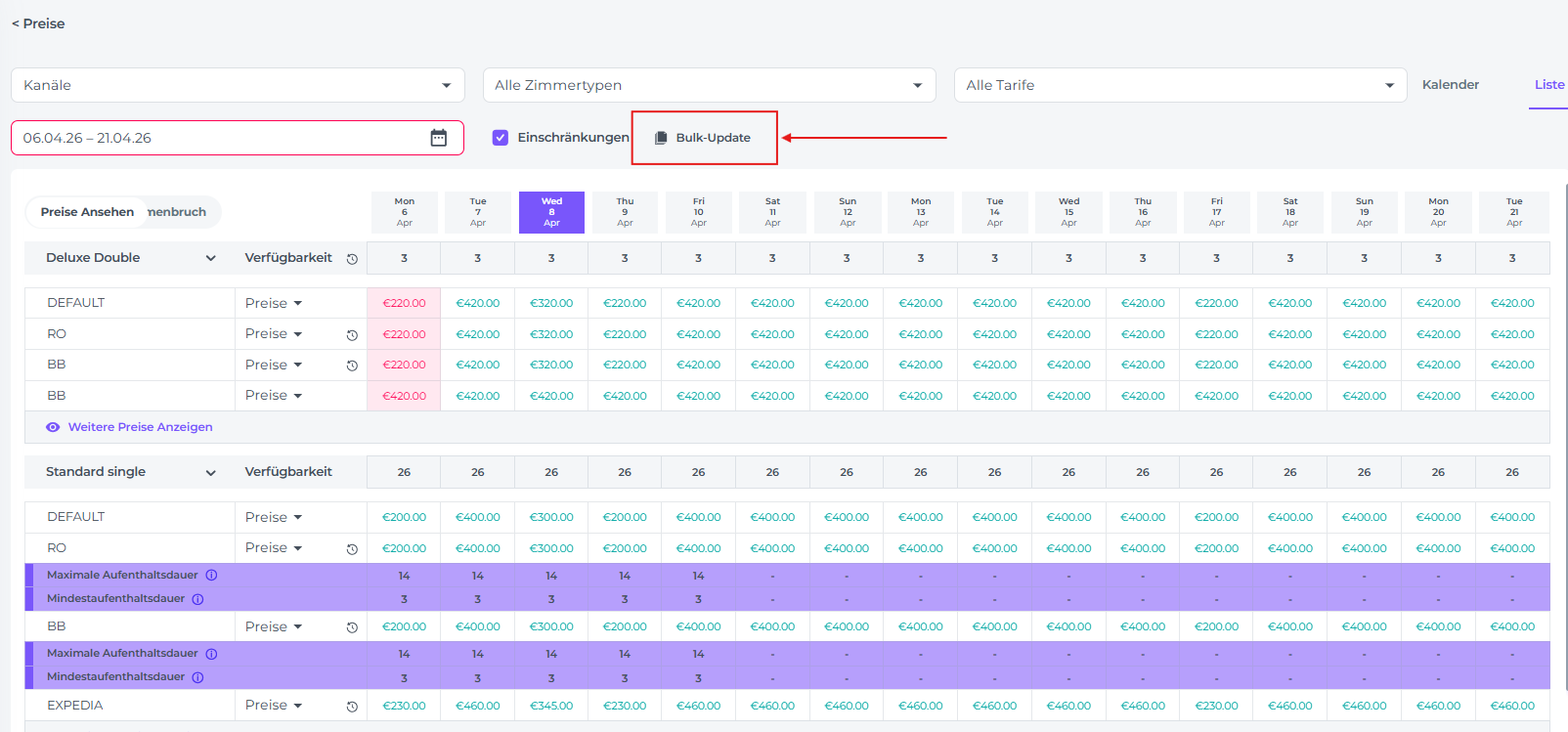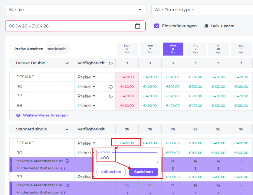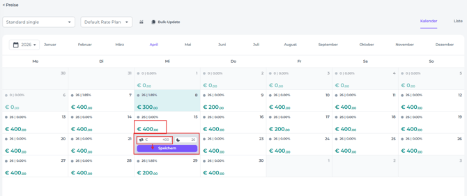 Klicke einmal auf den Preis für das jeweilige Datum, das du ändern möchtest, und führe die Aktualisierung durch: