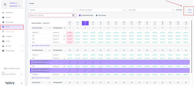 Preise für ein bestimmtes Datum anzupassen, ist in Noovy kinderleicht; nutze einfach die Kalenderansicht oder die Listenansicht, um das Ganze zu erledigen.