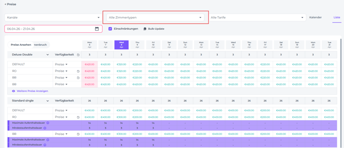 Wähle die Zimmertypen aus, die im Kalender angezeigt werden sollen. Wenn du nichts auswählst, bleiben alle Zimmertypen sichtbar: