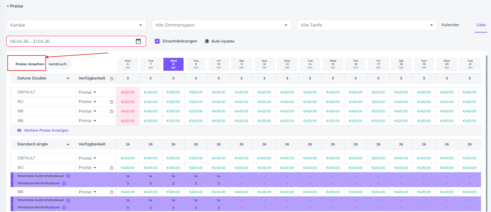 Hierüber kannst du die gewählten Ratenpläne innerhalb der jeweiligen Zimmertyp-Sektion einsehen. Die Preise müssen eingeblendet sein, um Änderungen vornehmen zu können: