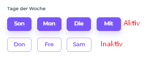 Wochentage: Wenn die Regel nur für bestimmte Tage gilt, kannst du die anderen Tage einfach abwählen. Die lila Felder werden dann weiß – das bedeutet, die Einschränkung ist für diese Tage deaktiviert.