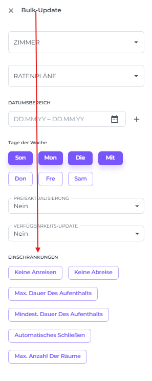 Hinweis: Wenn du Einschränkungen festlegst, nutze niemals den Standard-Ratenplan (Default). Anders als bei Preis- oder Verfügbarkeits-Updates werden Restriktionen im Default-Plan nicht automatisch auf andere Ratenpläne übertragen. Wähle daher bitte manuell alle Ratenpläne aus, die du einschränken möchtest. -