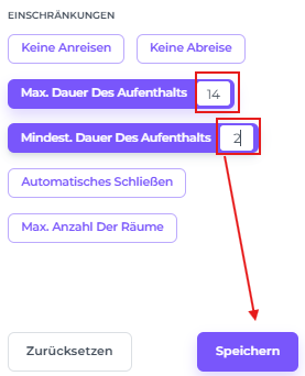 Es gibt Zeiträume, in denen du eventuell eine Mindestanzahl an Nächten für Buchungen festlegen möchtest oder umgekehrt verhindern willst, dass Gäste länger als eine bestimmte Anzahl von Tagen buchen.