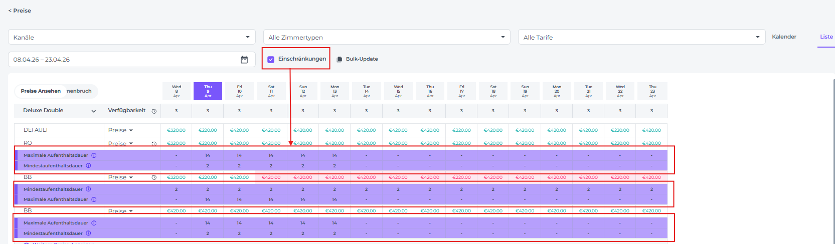 - Scrolle nach unten zu 'Restriktionen' und klicke auf 'Min. Length of Stay' oder