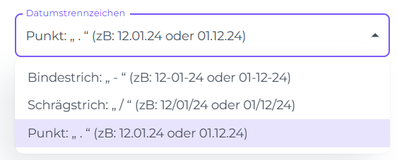 Hier legst du fest, wie die Bestandteile des Datums voneinander getrennt werden (z. B. durch einen Punkt oder Schrägstrich)
