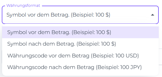 Wähle aus, in welchem Format Währungen angezeigt werden sollen