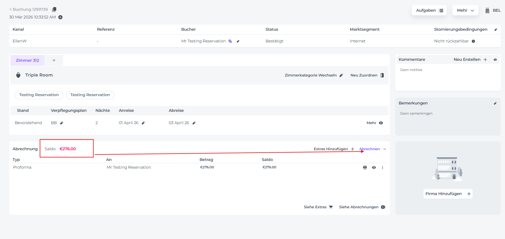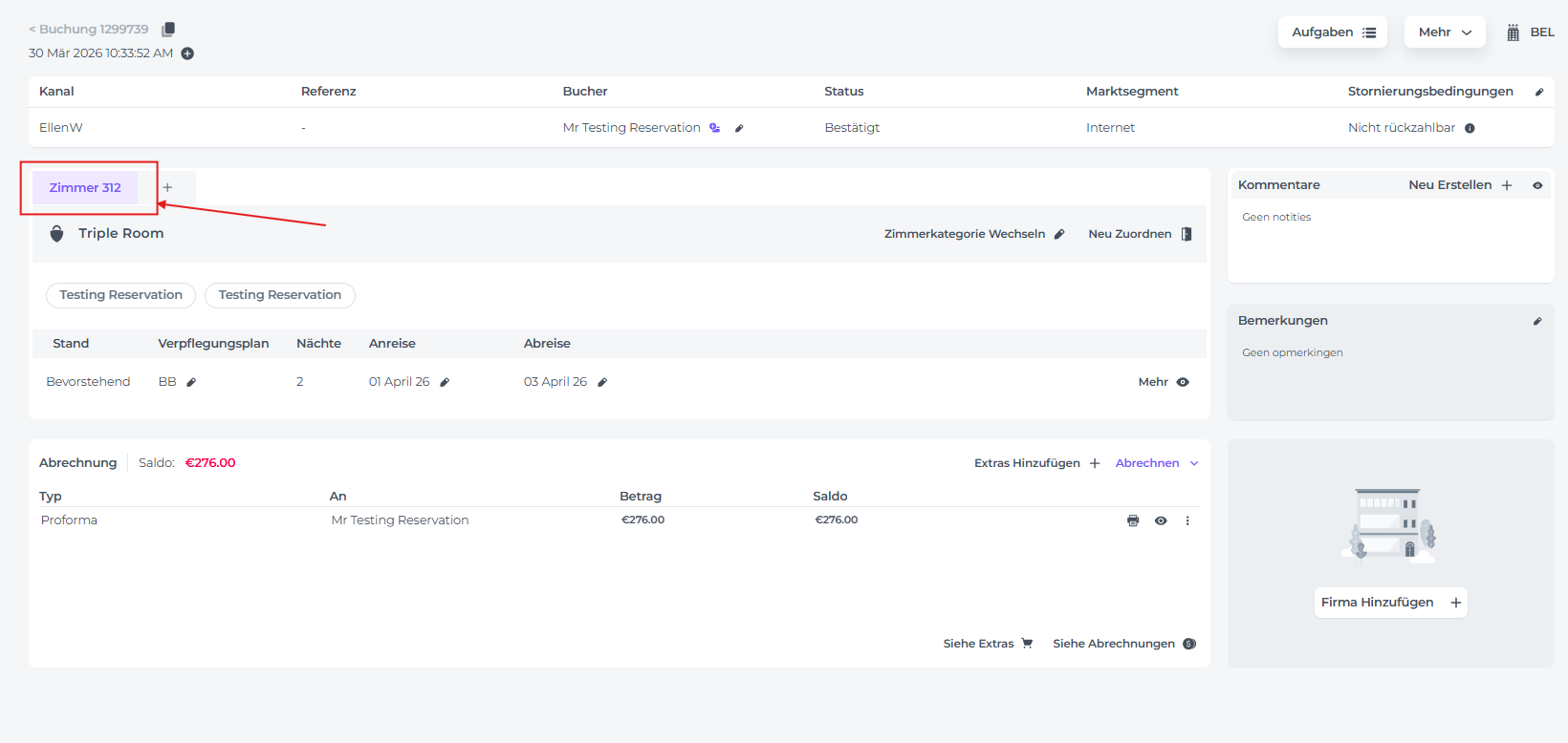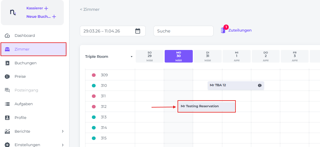 - Wenn du die Buchungsseite für die Reservierung des anreisenden Gastes aufrufst, stelle bitte sicher, dass ein Zimmer zugewiesen wurde:
