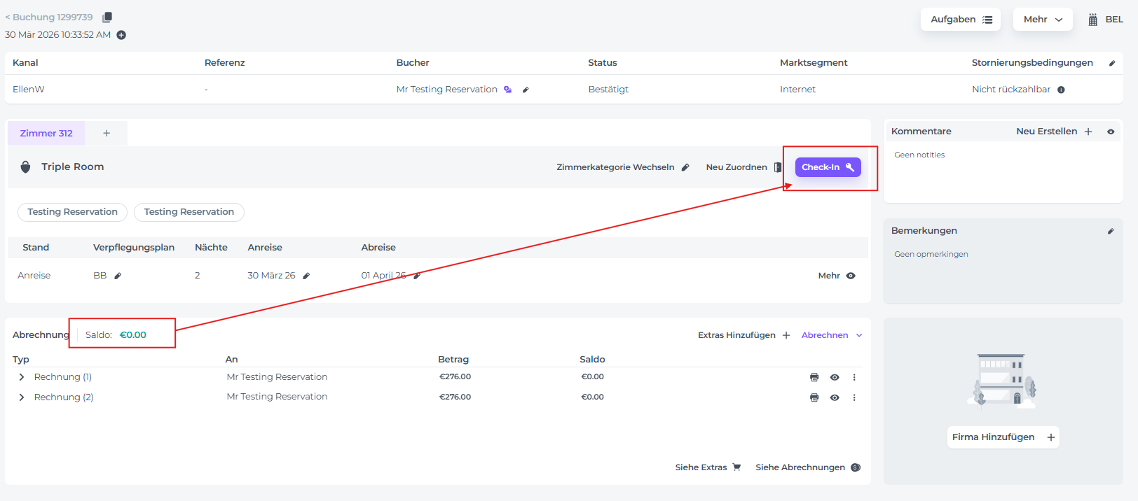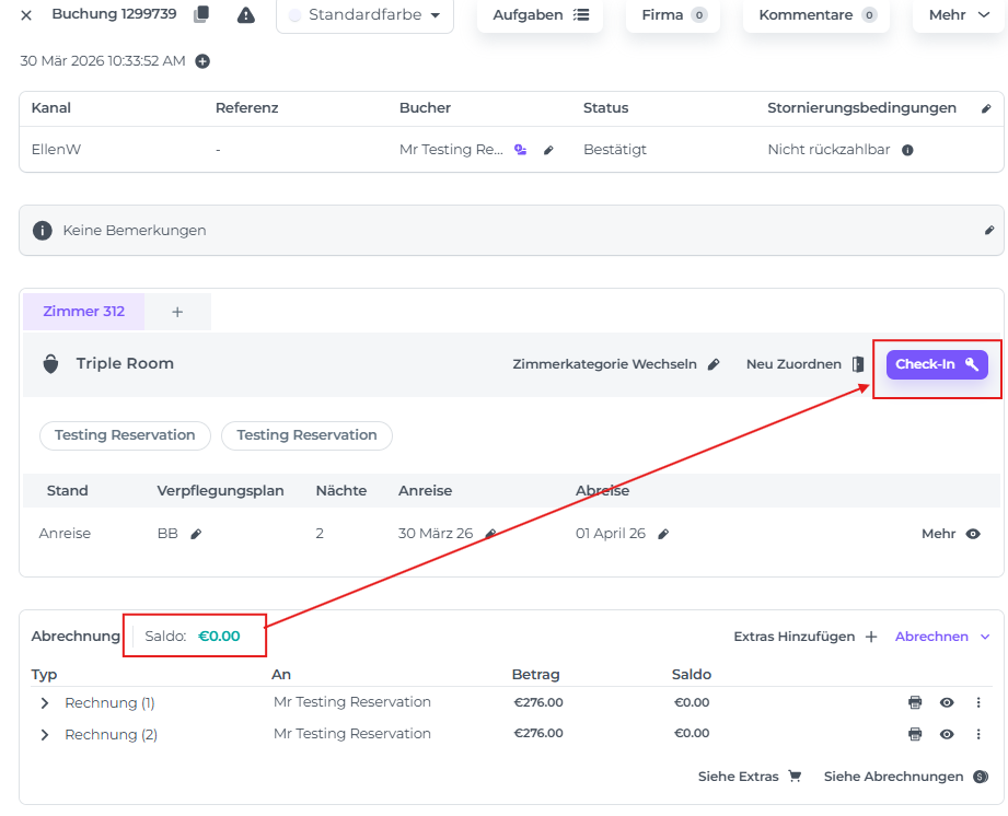 Prüfe, ob die Reservierung zugewiesen ist und der Saldo bei 0 liegt, und klicke dann auf die Schaltfläche Check-in: