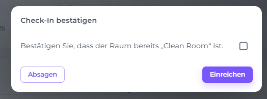 - Wenn das Zimmer den Status Schmutzig hat, fordert dich das Pop-up auf, zu bestätigen, dass das Zimmer tatsächlich gereinigt wurde. Aktiviere das Kontrollkästchen und klicke auf Absenden.