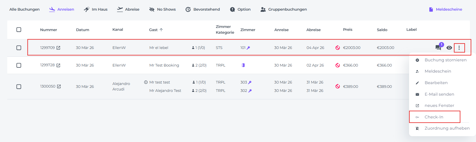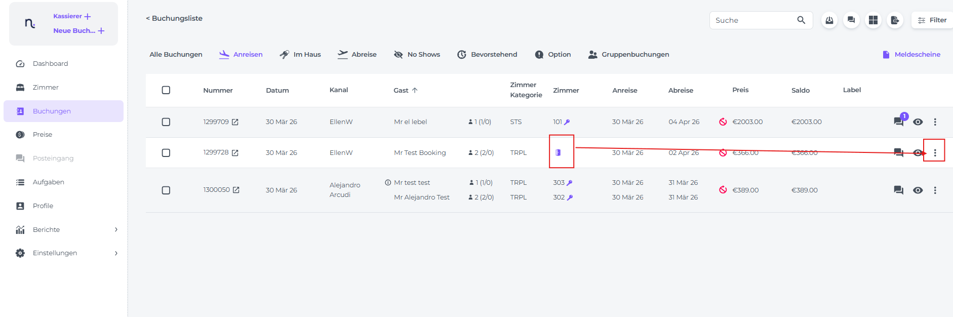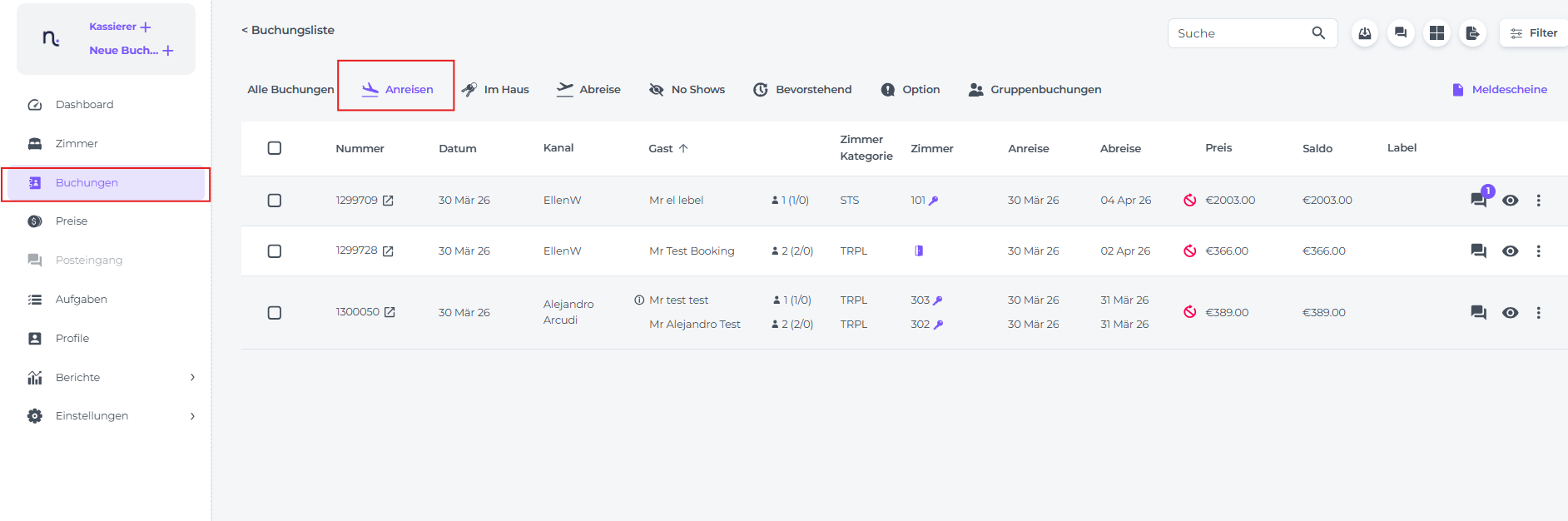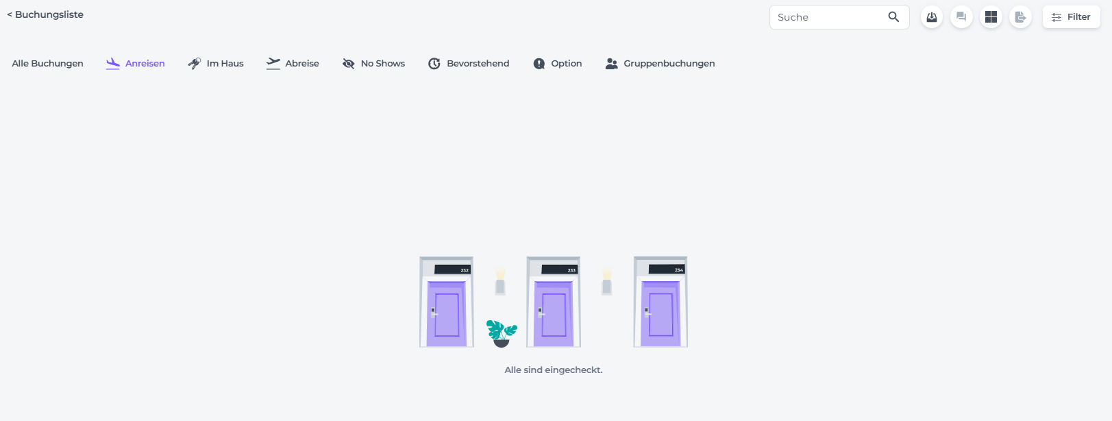 - Wähle im Hauptmenü Buchungen und klicke auf den Reiter Anreisen. Hier werden dir alle für heute erwarteten Reservierungen angezeigt: