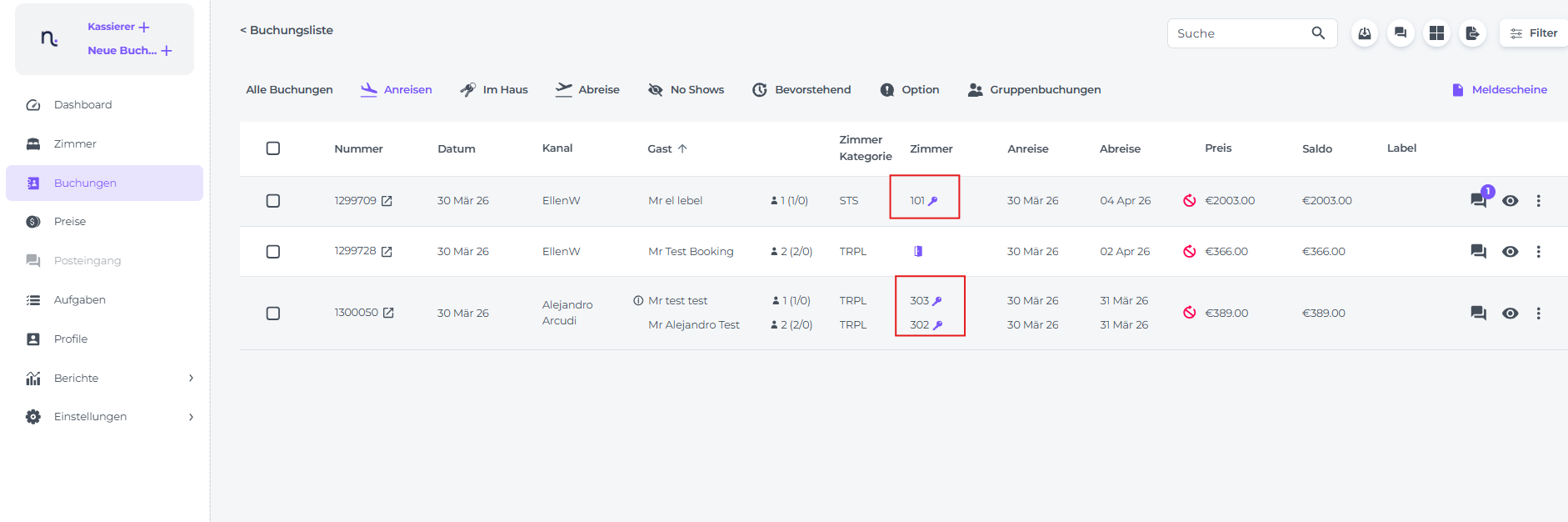 - Zugewiesene Buchungen zeigen die Zimmernummer und ein Schlüsselsymbol an.