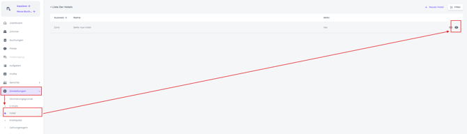 - Navigiere zu deinen Hoteleinstellungen über das Hauptmenü > Hotel und klicke auf das „Auge“-Symbol, um diese zu öffnen.