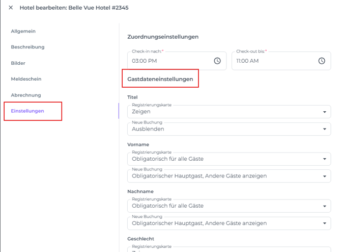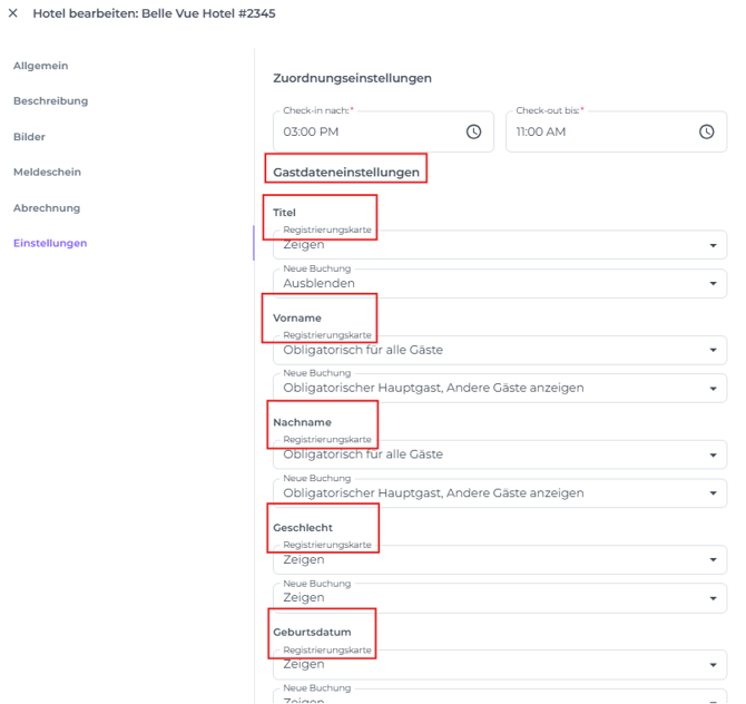 - Gehe in den Hoteleinstellungen zum Tab Meldeschein: