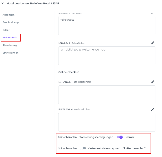 Es ist möglich, die Option „Später bezahlen“ für nicht erstattungsfähige Buchungen zu deaktivieren. Diese Konfiguration wird in einem separaten Bereich der Hoteleinstellungen verwaltet, dem Tab Meldeschein: