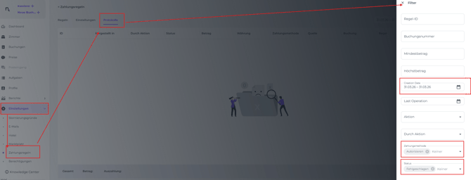 Navigiere zu Einstellungen > Zahlungsregeln > Protokolle. Nutze den Filter oben rechts und gib die folgenden Kriterien ein: