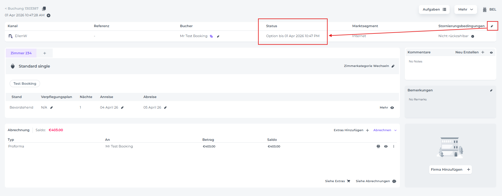 Bemerkungen zeigen normalerweise Kommentare von OTA-Buchungen (z. B. Booking.com) an. Da dies ein manueller Eintrag ist, lasse dieses Feld leer, außer du migrierst eine Buchung von einem OTA oder einem vorherigen PMS.