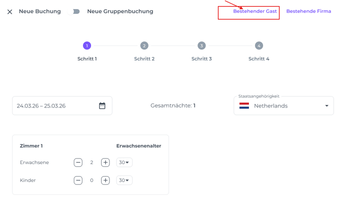 Für wiederkehrende Buchende (oder Gäste, falls der Buchende selbst übernachtet), klicke auf Bestehender Gast, um nach dem Profil zu suchen.