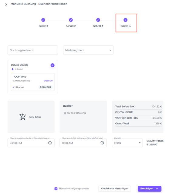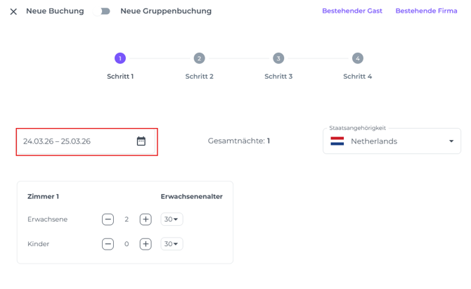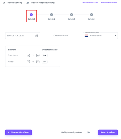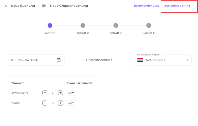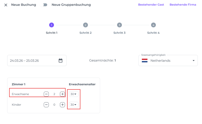 ☝️ Bitte beachten: Die Details in Schritt 1 beziehen sich auf den Buchenden. Wenn du hier ein Profil auswählst, wird Schritt 3 automatisch ausgefüllt. Falls der Buchende nicht der Gast ist, kannst du die Gastdaten später hinzufügen (wie in Schritt 3 beschrieben).