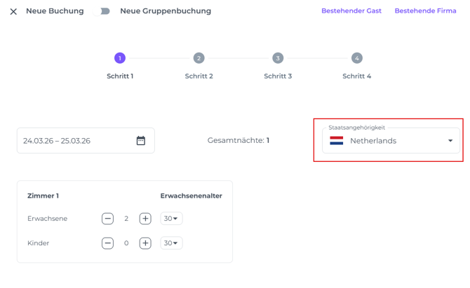 Wähle die Nationalität des Gastes aus.