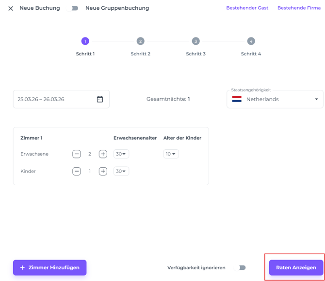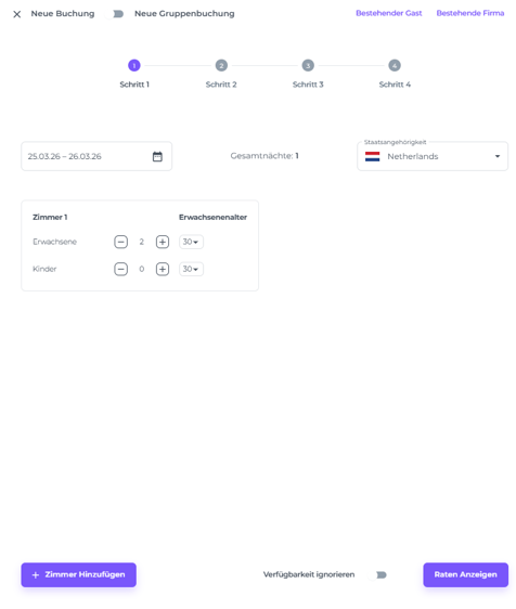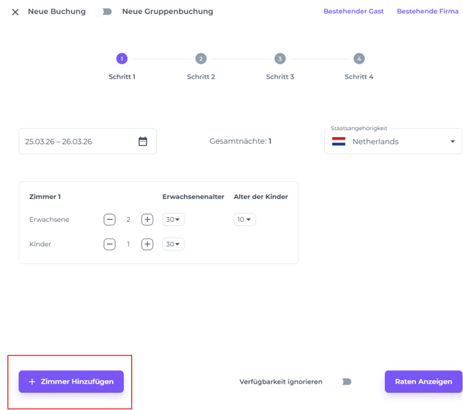 Du kannst der Reservierung weitere Zimmer hinzufügen, indem du auf + Zimmer Hinzufügen klickst.