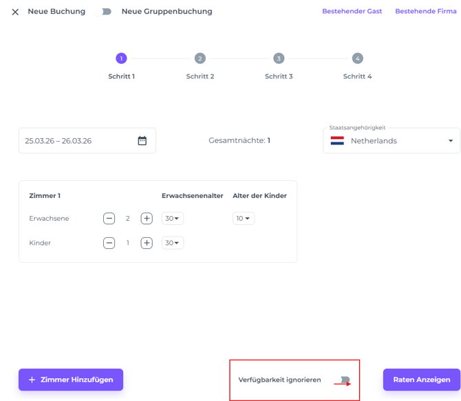 💡 Tipp: Wenn das Hotel ausgebucht ist und deine Berechtigungen Überbuchungen zulassen, aktiviere "Verfügbarkeit ignorieren", um mit der Reservierung fortzufahren.