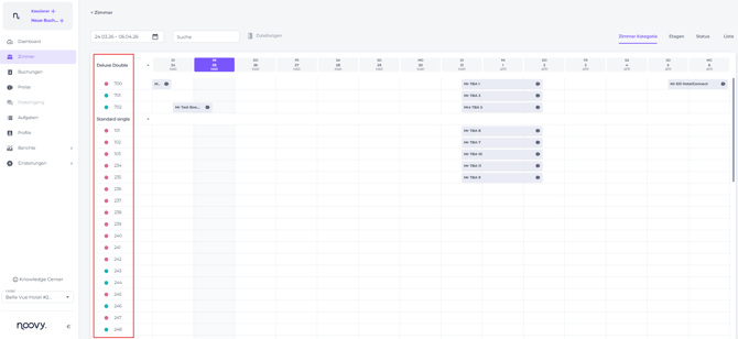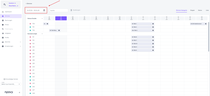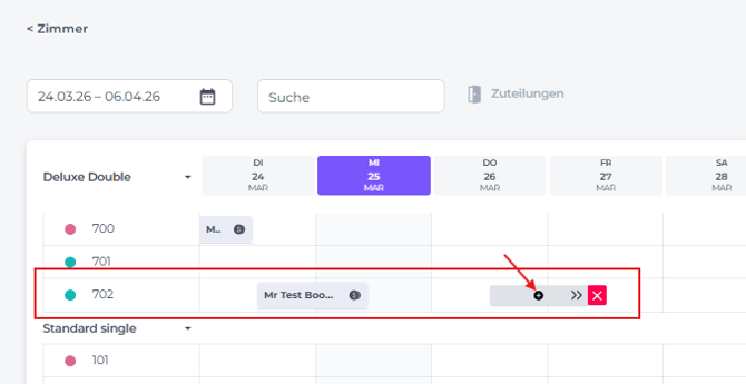 - Um die Buchung zu verlängern, klicke auf den Doppelpfeil, halte ihn gedrückt und ziehe den Balken bis zum Abreisedatum.