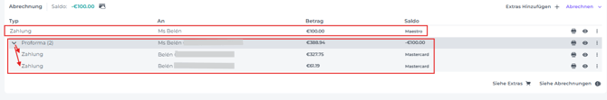 • Zahlungen können als einzelner Posten in der Liste stehen oder direkt mit einem Dokument (z. B. einer Proforma oder Rechnung) verknüpft sein. Klicke auf den Pfeil (>) neben einem Dokument, um die verknüpfte Zahlung anzuzeigen:
