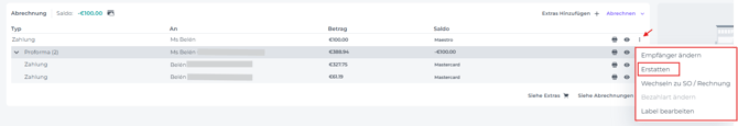 • Klicke auf die drei Punkte (Mehr Aktionen) am Ende der Zahlungszeile. Ein Pop-up erscheint. Klicke dort auf Erstatten: