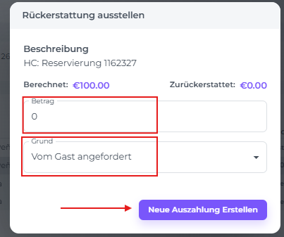 • Gib im nächsten Fenster den Betrag und den Grund für die Rückerstattung ein und klicke auf Neue Auszahlung Erstellen :