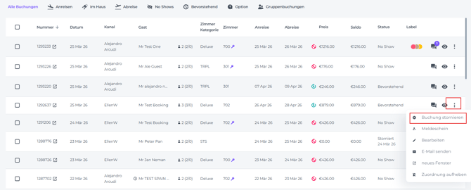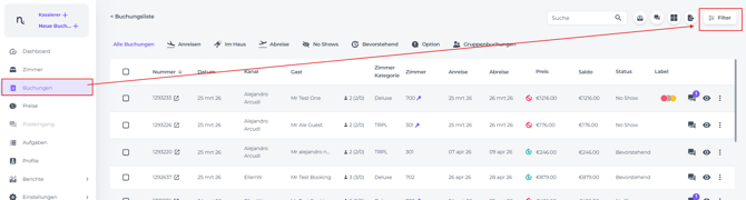 - Wähle im Hauptmenü Buchungen und verwende den Filter, um nach der Buchung zu suchen, die du stornieren möchtest: