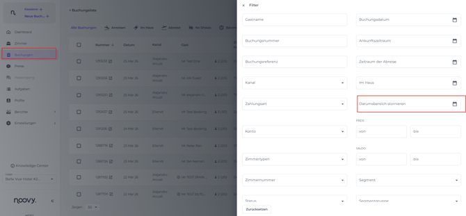 Um einen Bericht über Stornierungen für einen bestimmten Zeitraum zu erstellen: Wähle im Filter der Buchungsliste „Datumsbereich Stornieren“ und wähle den gewünschten Zeitraum aus, in dem die Stornierungen vorgenommen wurden.