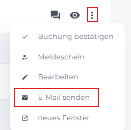 - Eine Stornierungsbestätigung kann gesendet werden, indem du auf die Schaltfläche „Weitere Aktionen“ neben der Buchung klickst und „E-Mail senden“ auswählst.