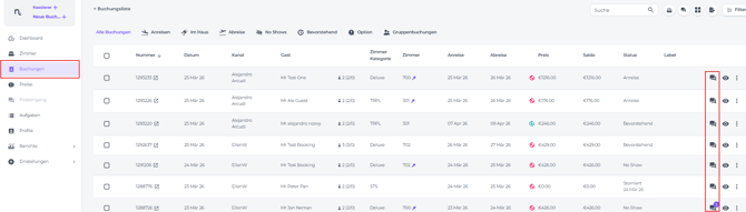 - Wähle im Hauptmenü Buchungen und klicke auf das Kommentar-Icon hinter der entsprechenden Buchung.
